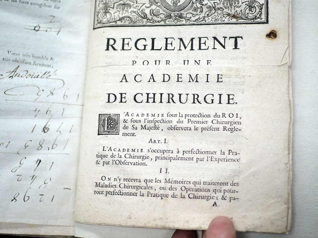 L’autre titre étonnant est un ouvrage publié à Paris en 1772 intitulé « Statuts et réglemens généraux pour les maîtres en chirurgie des provinces du royaume ». Premier élément d’intérêt, il est habillé d’une belle reliure en parchemin de récupération qui se trouve à être un vieil acte notarié en français ancien que nous n’avons pas encore daté. Ensuite, il porte des annotations manuscrites qui nous apprennent qu’il a appartenu à un chirurgien français nommé Simon Étienne Hugues Morelot (1751-1829). Celui-ci a indiqué, dans une note sur la page titre, avoir reçu cet ouvrage lors de sa réception comme lieutenant du premier chirurgien du roi pour la région de Beaune en octobre 1783. En effet, à cette époque, le premier chirurgien du roi est représenté dans les diverses provinces de France par des lieutenants qui relèvent de son autorité. C’est Pichault de la Martinière qui est alors premier chirurgien du roi et les « Statuts et réglemens » lui sont d’ailleurs dédiés et portent ses armes. Enfin, ce qui rend ce document encore plus exceptionnel c’est qu’il contient plusieurs lettres et documents divers qui ont été reliés avec le texte principal. Une lettre nous apprend ainsi que Pichault de la Martinière vient tout juste de décéder après 36 années de loyaux services auprès des rois Louis XV et Louis XVI qui l’avaient grandement apprécié. Une autre lettre adressée à Morelot par le nouveau chirurgien du roi, Jean-Baptiste Antoine Andouillé, l’invite désormais à se rapporter à lui. Comme ce titre jure un peu avec le reste de la collection du Dr Nadeau, nous avons un instant douté qu’il puisse lui avoir appartenu. Cependant, nous avons retrouvé dans la collection un titre sur les ex-libris de médecin français où les armes de Pichault de la Martinière étaient bien en vue, confirmant du coup son appartenance à la collection du Dr Nadeau!